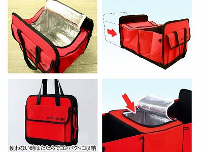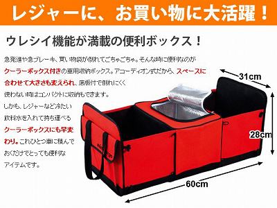 車での買い物の時に発進やブレーキでトランク内の買い物袋が倒れてゴチャゴチャになるのを防ぐ便利な簡易クーラーボックス付きの車用収納ボックスです。