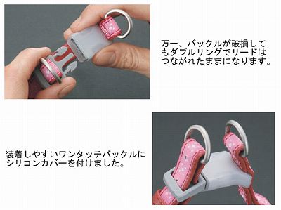 万一、バックルが破損してもダブルリングでリードとつながれているので、はずれることはありません。