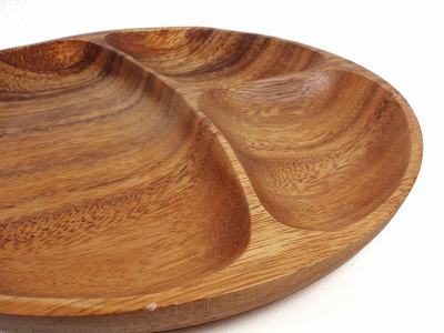 このランチプレートは濃淡のある木目のコントラストが目を引くアカシア材を使っています。