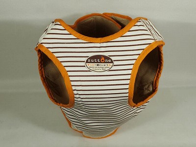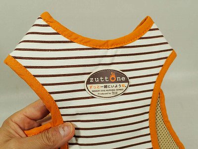①前足を通し穴にワンちゃんの前足を通します。(外側のワッペンが付いている方が首側になります)